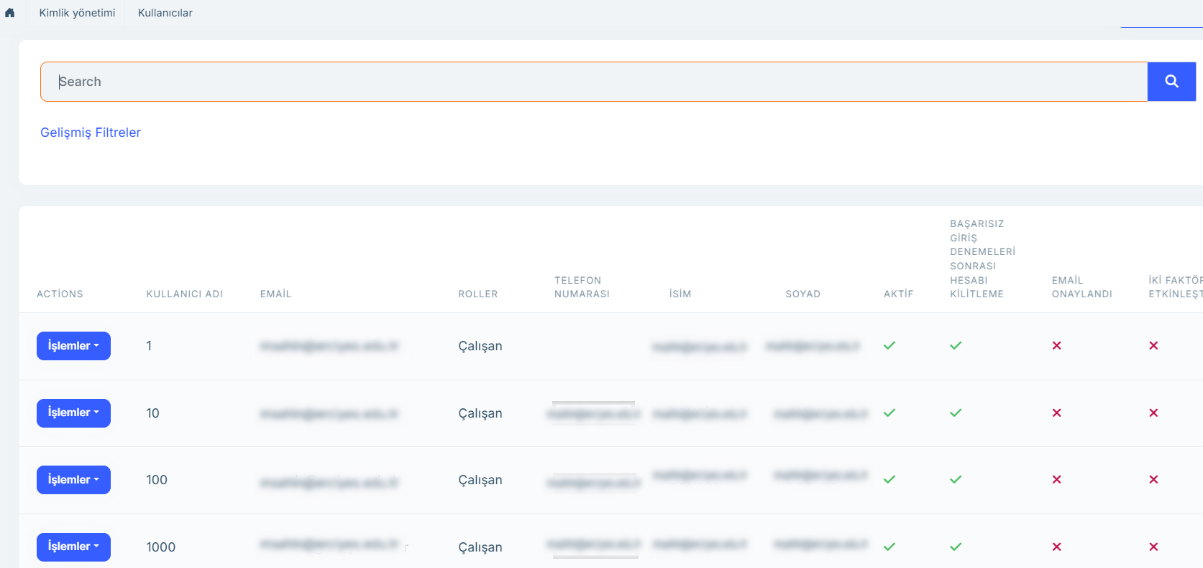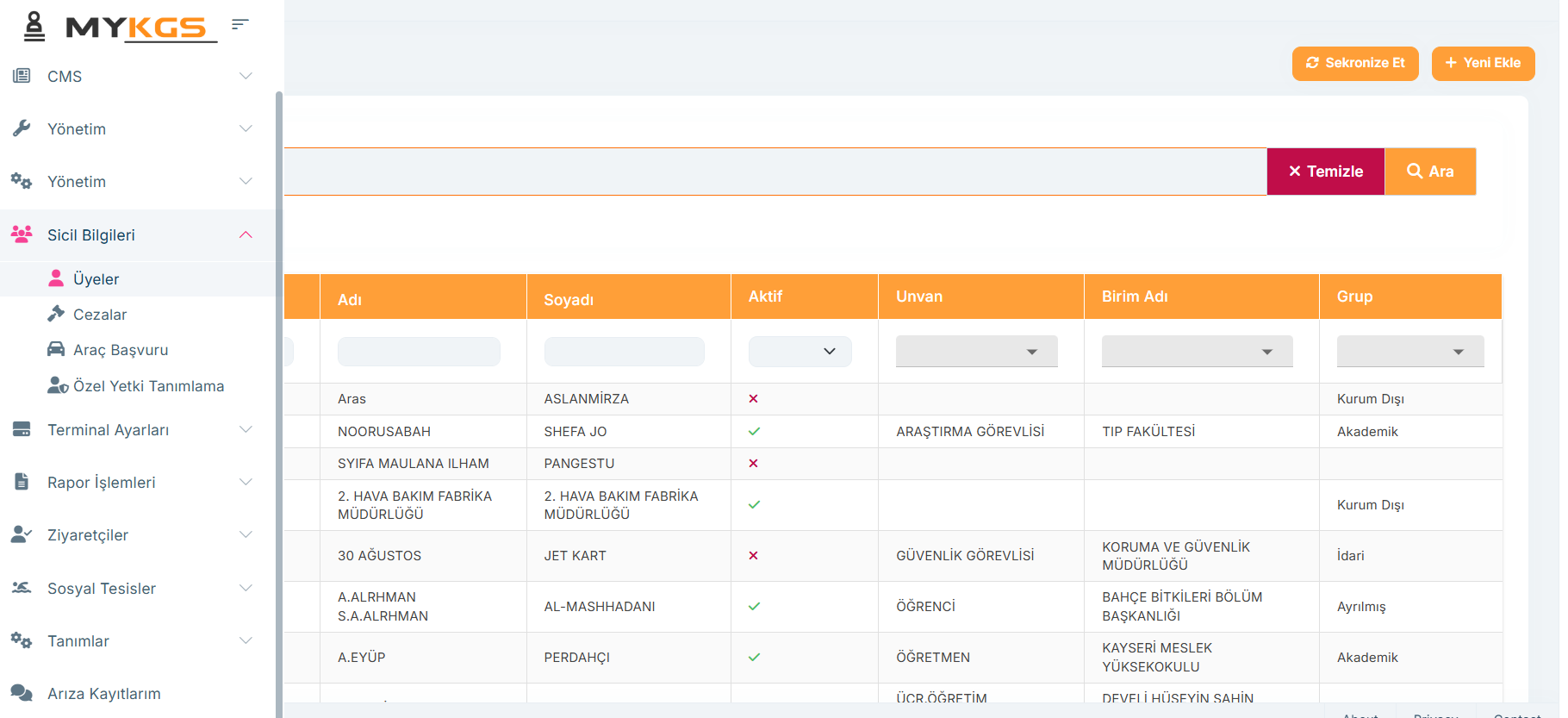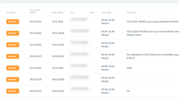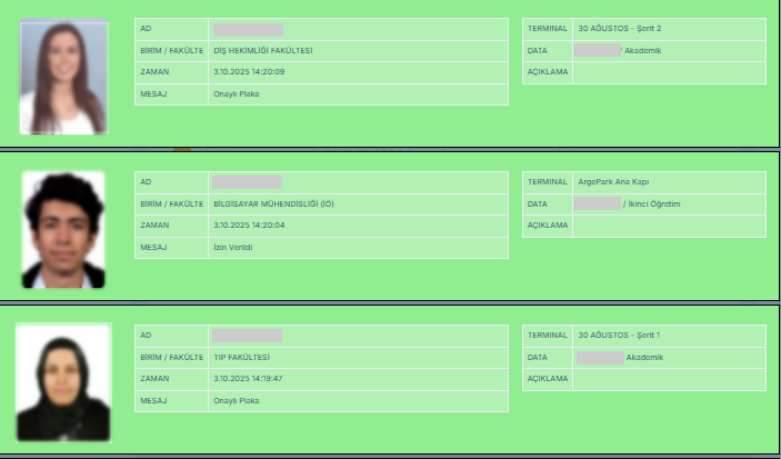 Öğrenci, personel ve misafir kayıtlarının merkezi yönetimi; yetki tanımlamaları kolay arayüzle yapılır.